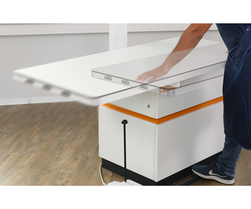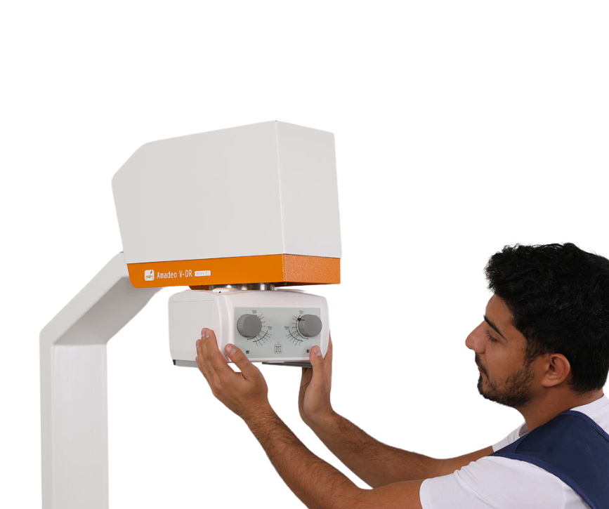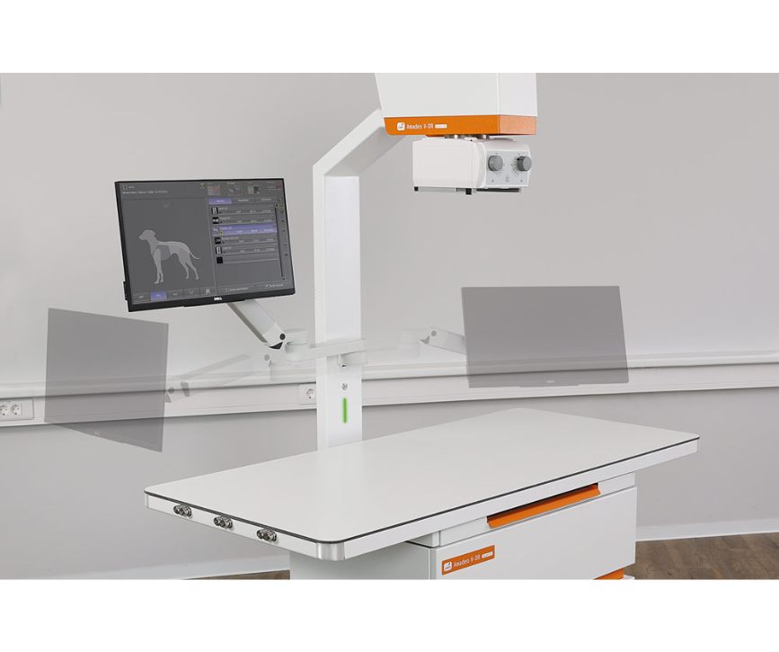 Amadeo V-DR mini II system – Ett utrymmesbesparande komplett röntgensystem för veterinärmedicin med vridbar monitor och med anslutning till standarduttag. Har en rörlig bordsskiva för röntgenundersökning av smådjur. En stor integrerad låda med två fack ger tillräckligt med utrymme för t.ex. positioneringshjälpmedel och smådelar. Högfrekvensgeneratorn på 32 kW är även den direkt integrerad i röntgenbordet och har ett vridbart ljusvisir.