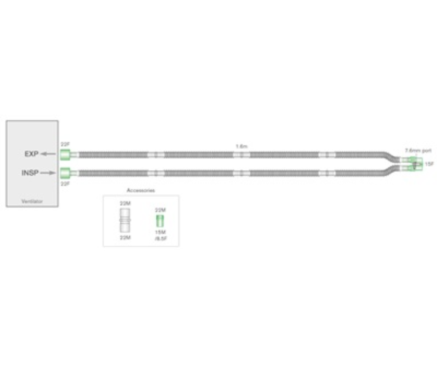 Andningssystem 10x1600mm med Y-stycke, knä och CO2 port med säkerhetslock. Unik anslutning mellan muff och slang som förhindrar läckage.