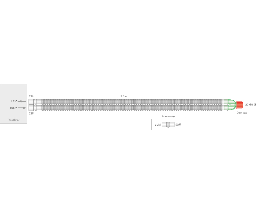 Andningssystem 22x1600mm med rak Y-koppling, cirkelsystem. Anpassad för generell anestesi. Unik anslutning mellan muff och slang som förhindrar läckage.