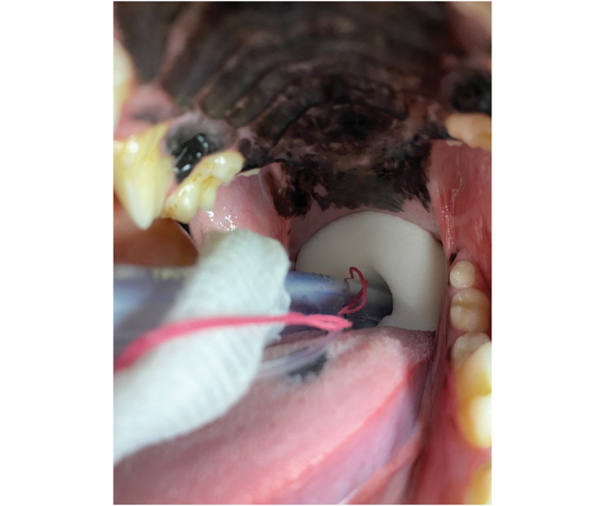 Tråden som sitter på ringen knyts samman med endotrachealtubens fixeringsknut.