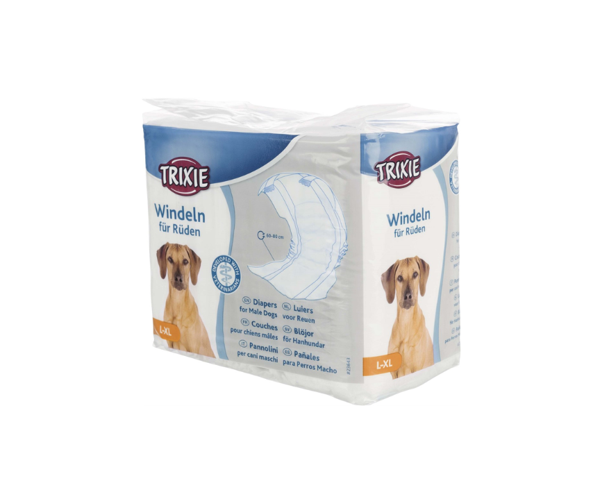 Blöjor för hanhundar i tre olika storlekar.