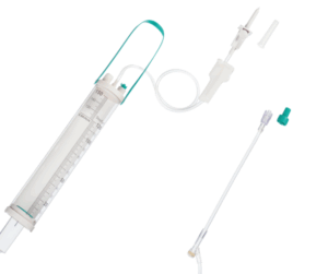 Volymkontroll för IV administration set med doserings behållare 150 ml. Lämplig för gravitations infusioner.Flexibel, transparent droppkammare med mikro dropper, 60 droppar = 1 ml ± 0,1 ml (aqua dist.)