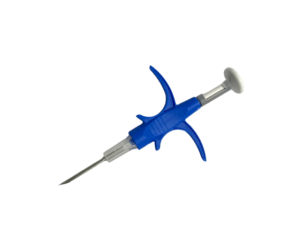 EasyTrac-ID mikrochip i en engångsinjektor med nål levereras i en steril förpackning tillsammans med 8 medföljande streckkodsetiketter (EAN 128) och är färdig att användas.
