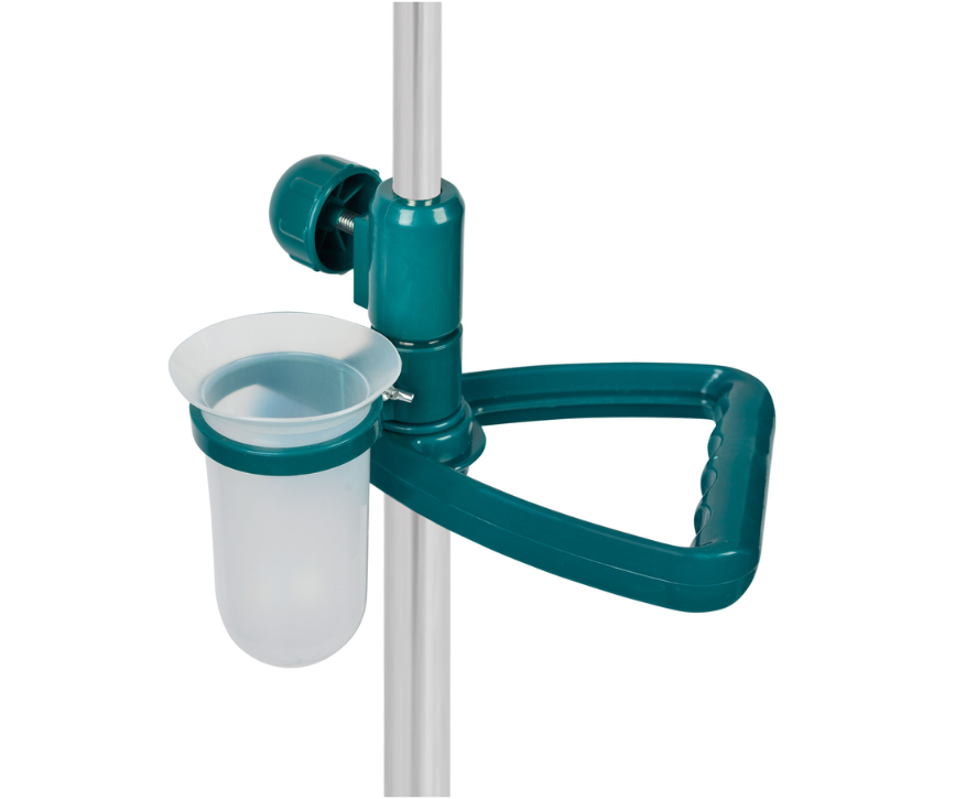 Förkromad infusionsställning med steglös höjdjustering från 110 – 200cm. Elegant kors i plast med grön färg. 5 lättrullade hjul varav två låsbara. Har en liten behållare fäst vid handtaget.