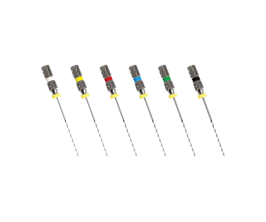 K-Reamer filar av material Nickel Titanium (Ni-Ti) för ökad styrka och flexibilitet vid krökta rotkanaler. Dessa filar har samma färgkodning som Guttaperka spetsarna har.