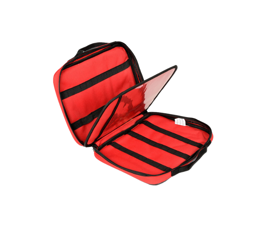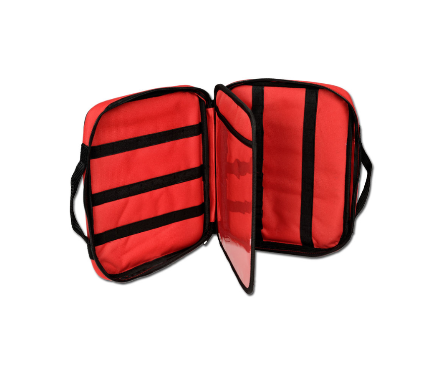 Läkemedelsväska Maxi i polyester – Håller upp till 46 läkemedelsflaskor/ampuller av olika storlekar. Elastiska band för att hålla 9st stora respektive 37st små ampuller på ena sidan, och 24st små ampuller på den andra sidan. Väskan har även en skiljevägg med transparanta fickor.