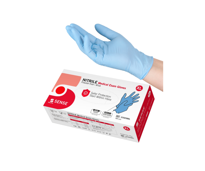 Selefa nitrilhandskar SENSE är en blå, vattentät undersöknings- och skyddshandske mot minimala kemiska risker och mikroorganismer (Complex Design). Nitrilhandsken är tunn, passar båda händer och är lätt att ta på och av. Den har en utmärkt passform och en rullkant som ger extra styrka åt kragen. Handsken ger god taktil känslighet och är utformad med mikrotexturerade fingertoppar som ger ett säkert grepp i både våt och torr miljö.