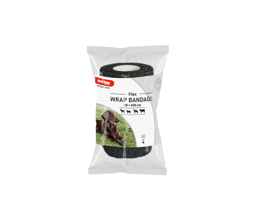Snögg Flex Wrap Bandage – Ett flexibelt och elastiskt självhäftande textilbandage. Fastnar inte i vare sig päls, hud eller sår och är idealiskt för fixering av kompresser och självhäftande skumförband. Skyddar mot smuts och fukt.