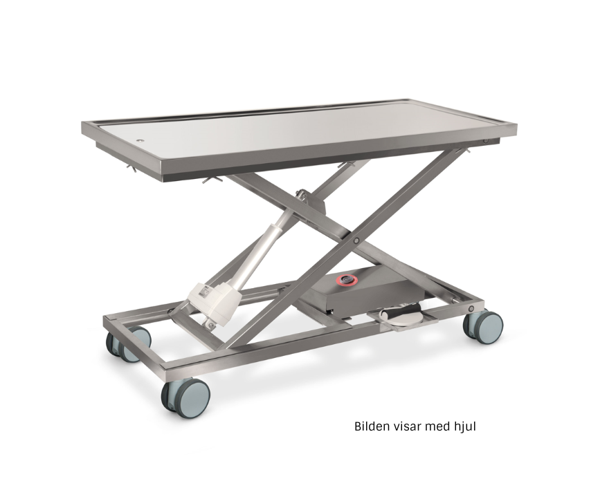 Steglös elektriskt höj & sänkbart bord mellan 28 – 105 cm, detta underlättar för djuret att komma upp samtidigt som en bra arbetshöjd uppnås. Underredets konstruktion bidrar till, och ökar bordets och bordsplattans stabilitet. Fötterna är enskilt ställbara för att få stabilitet även på ett ojämnt golvmaterial.