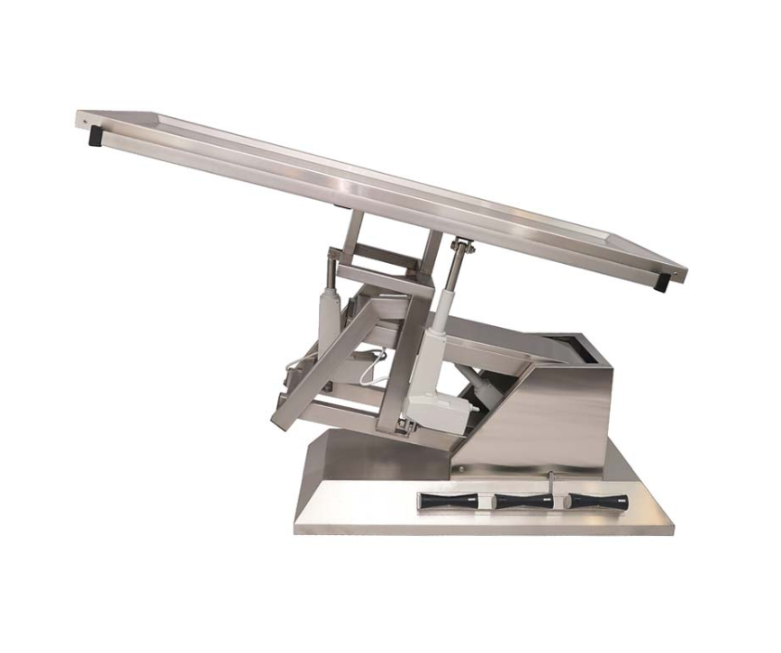 Vetinox operationsbord från TA700-serien, med ram och skålad bordsskiva i rostfritt stål. Justera både höjd och bordsskivans lutning elektriskt med hjälp av fotpedalen, – underlättar finjusteringar och åtkomst till hela operationsfältet. Detta bord har även tillgång till lateral tilt.