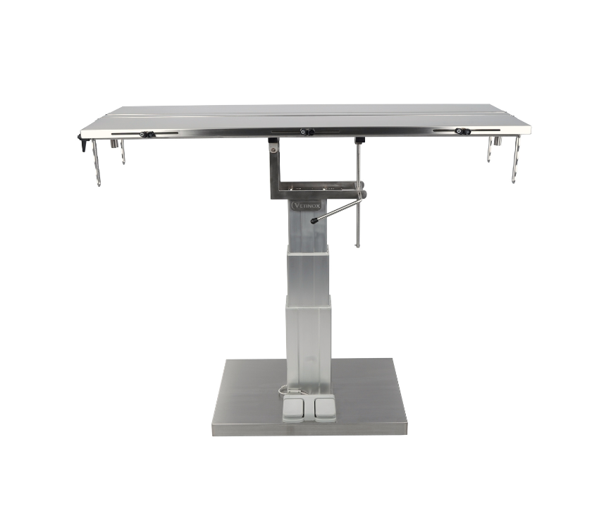 Vetinox operationsbord med V-top samt ram i rostfritt stål. Bordsskivan kan tiltas manuellt, vilket underlättar åtkomst till hela operationsfältet.