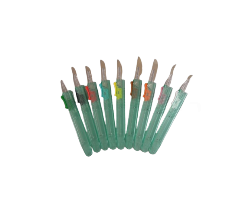 Säkerhetsskalpeller för engångsbruk. Skalpellen är användarvänlig för både vänster- och högerhänta, då bladet matas fram på ovansidan av skaftet.